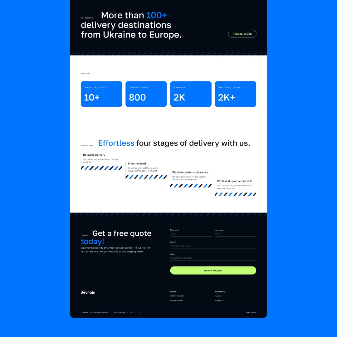 A rail freight service connecting Ukraine and Europe. The task was to design a modern, conversion-focused landing page that highlights the benefits of rail transport and makes it easy for clients to reach logistics experts.