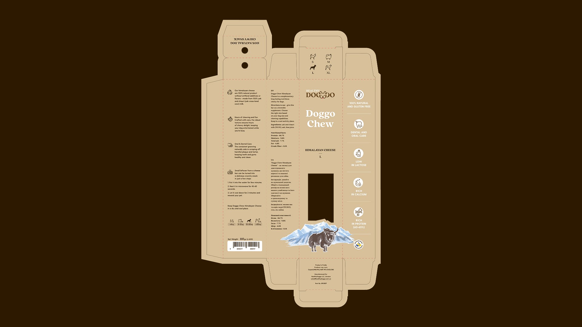 • Eco-inspired packaging design with kraft textures, earthy colors, and clean minimalistic typography to communicate natural values. • A clear icon system to highlight key product benefits: lactose-free, gluten-free, high protein, 100% natural. • Added a transparent window to let customers see the product. • Subtle yak and Himalayan landscape illustrations to emphasize authenticity and origin. • Print-ready dielines prepared for smooth production. • A custom icon set created for packaging and marketing use. • Consistent social media & website banners to strengthen the brand across channels.