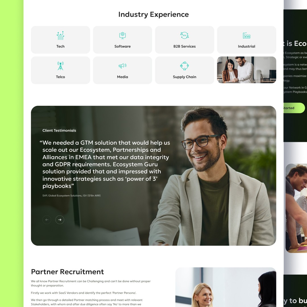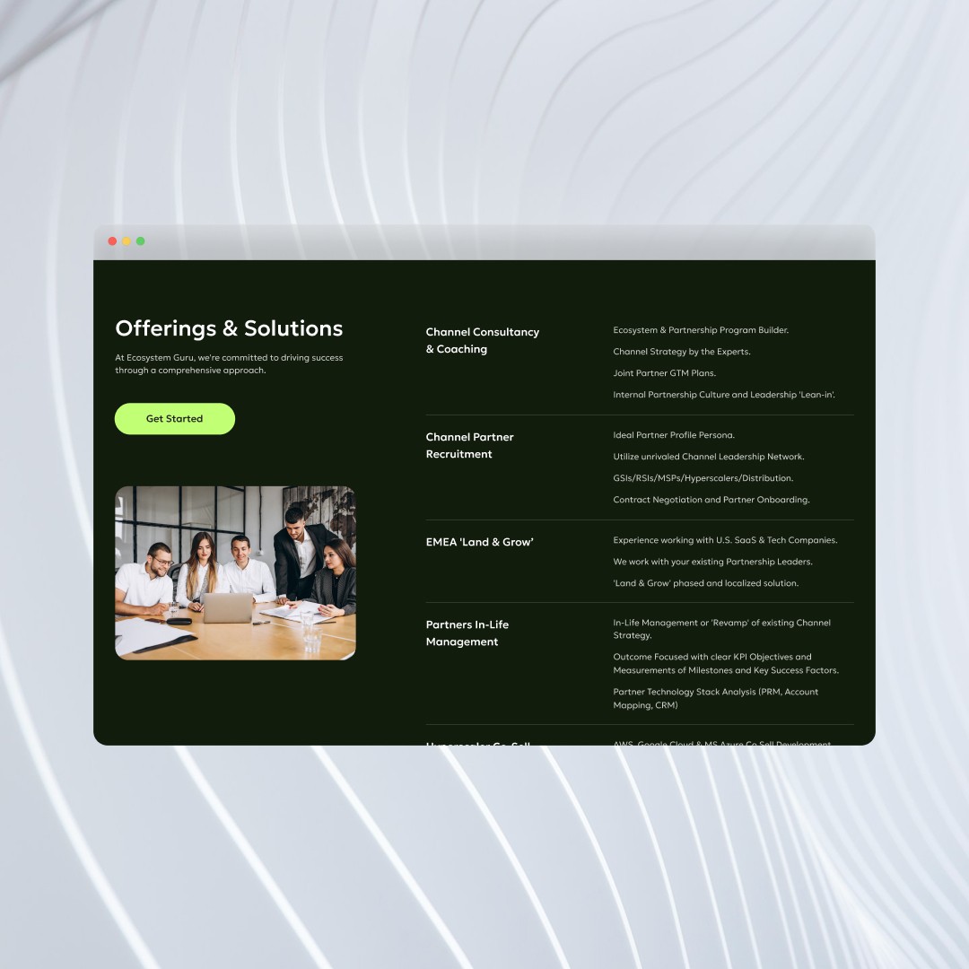 Create a modern, clear, conversion-focused landing page that: • Explains the value of partner ecosystems and channel growth strategies. • Showcases the company’s story and expertise in maximizing revenue through indirect ecosystems. • Presents offerings and content in a clear, structured way. • Builds trust and attracts new clients and strategic partners