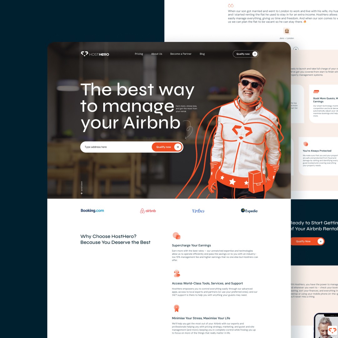 • Delivered a professional, conversion-focused website that clearly communicates HostHero’s services and value. • Improved user flow and onboarding, making it easier for property owners to sign up and start using the platform. • Strengthened the brand identity with consistent visuals, typography, and custom iconography. • Integrated an interactive Typeform pages, streamlining the application process. • Created a fully responsive, fast-loading experience that performs smoothly across all devices.