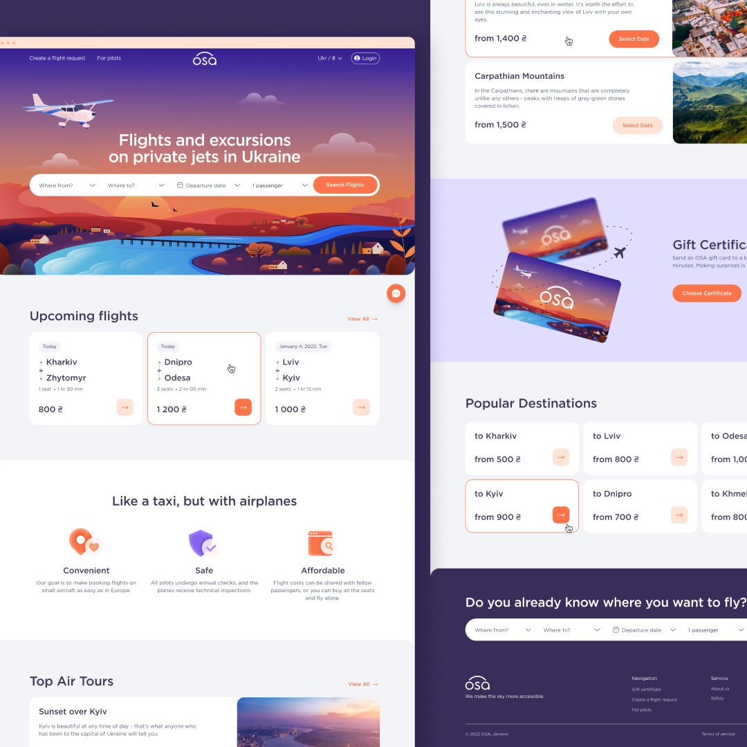 The main challenge was to design a clear and intuitive platform for a complex service where different user types (owners, pilots, and passengers) interact. It was important to make the booking process seamless, visualize flight options in a user-friendly way, and communicate OSA’s mission of making private aviation open to everyone.